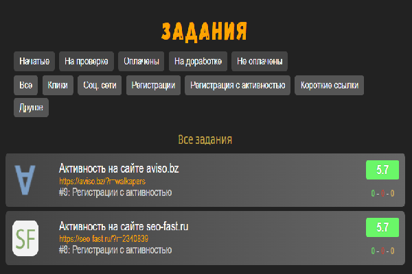 Тут придельно должно быть все понятно. Первая сточка кнопок отвечает за сортировку уже выбраных вами заданий ранее, текущие задания и естественно результаты по ним. Вторая строчка отвечает за сортировку самих заданий по категориям. Их у нас не слишком много, но пока хватает. И уже когда вы определились с заданием, нажмите на его название. Вы попадете на страницу самого задания: