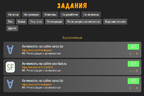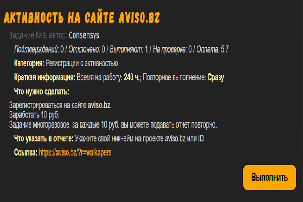 На скриншоте можем видеть одно из таких заданий, содержание и так понятно, минимум текста максимум информации. Страница задания содержит несколько необходимых пунктов, а имменно название, номер задания и автора, строку статистики по данному заданию за все время, категорию задания, время, выделеное заказчиком на работу для исполнителя и возможность повторять выполнение даного задания через какое-то время. Основной пунк "что нужно сделать:", тут находится основная задача к выполнению от заказчика, а в разделе "Что указать в отчете:" - результат вашей работы над данным заданием (обычно какой-то индентификатор, числа, цыфры, ники на проектах или ссылки. Тут важно помнить что для защиты своих данных мы их не распространяем на лево и на право. Следующий пункт ето адрес ссылки по которой нужно будет перейти после нажатия кнопки "ВЫПОЛНИТЬ". Ну и если вы выбрали работать именно над этим заданием то нажимайте смело кнопку "ВЫПОЛНИТЬ".
